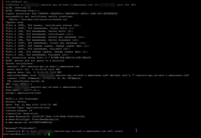 I created a new EC2 instance using the Amazon Linux 2 AMI and put it in the same VPC and subnet as the ECS instance that received the HTTP 403 response. I also created a new regional API Gateway that has one MOCK integration method that will always return a status code of 200. The API Gateway has no authorization requirements and was publicly available. The same 403 forbidden behavior was once again exhibited but this was good news. Now I knew that the application code had no impact on the observed behaviors. This meant that we could focus on triaging the networking configurations. Here is the output from calling the test API Gateway endpoint from the test EC2 instance: