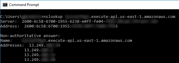 Near the bottom is the HTTP/1.1 403 Forbidden response I received from the EC2 but do you see the IP address resolved for the execute-api.us-east-1.amazonaws.com domain? Well probably not because I blurred most of it out but its at the top. You can see that the IP starts with a 10 and you may recall that the 10.0.0.0/8 CIDR block is reserved for private networking. That is significant because the API Gateway is regional and has an IP in the public namespace. A nslookup from my computer reveals: